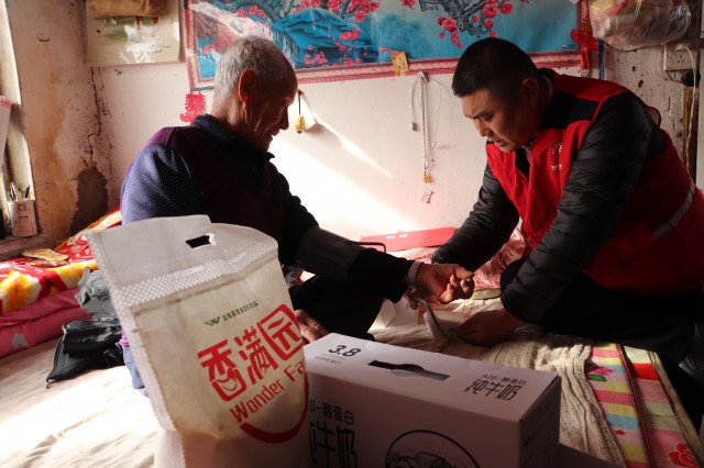 “于爷爷,您是英雄的后代,也是我们的宝贵财富。祝您健康长寿,福寿安康!”志愿者将一副特意书写的遒劲“寿”字和寓意吉祥的春联送到老人手中,并送上米面油奶等慰问品。随行的健康志愿者还为老人测量了血压,给予细致的健康指导。临别时,老人紧紧握着志愿者的手,连声道谢:“谢谢你们总记得我,心里头热乎乎的,党和政府还有你们的好我都记着呢!”