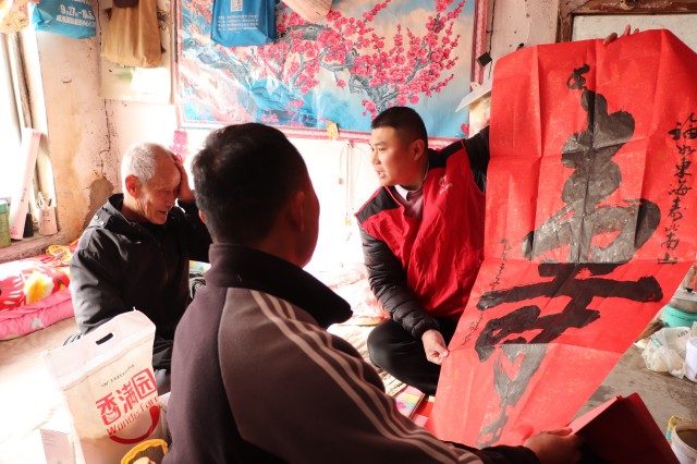 走访入户,殷殷关切润心田。送福活动结束后,志愿者们携带米、面、食用油、牛奶等生活必需品以及春联福字,分组深入村中,走访慰问了军烈属及部分困难群众。在84岁的五保烈属于爷爷家中,志愿者们围坐在老人身旁,详细询问了他的身体健康状况和日常起居,并叮嘱他注意防寒保暖。谈及往事,于爷爷眼中泛起光芒,与大家共同追忆起其父亲于升祥烈士的革命事迹。那段峥嵘岁月与红色记忆,透过老人的叙述,深深触动了在场的每一个人。