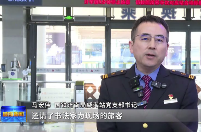 国铁济南局威海站党支部书记马宏伟表示,威海高铁站的书香驿站,是省内首家落地的高铁书香驿站,还请了书法家为现场的旅客送对联、写福字、画国画。同时也把威海的这种传统的非遗项目,像剪纸、玻璃画还有面塑进行了集中的展示,就是让“高铁+非遗”成为今年春运的文化底色。