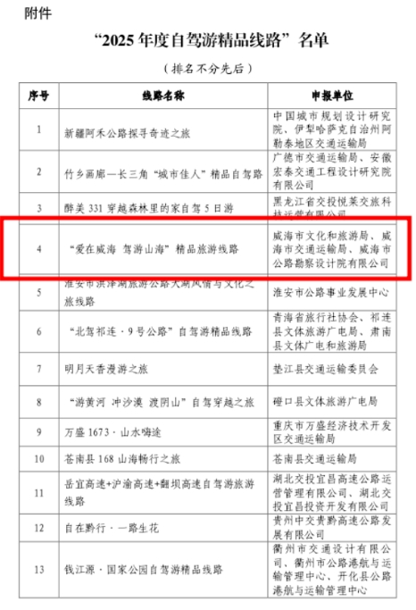近日,中国公路学会旅游交通工作委员会、中国旅行社协会自驾旅行分会共同公布“2025年度自驾游精品线路”,最终确定20个精品项目。“爱在威海 驾游山海”精品旅游线路成功入选,为全省唯一上榜线路。