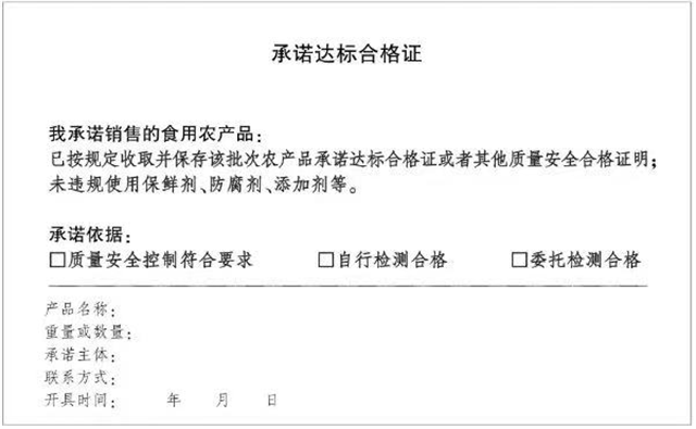 一、充分认识承诺达标合格证的重要意义。承诺达标合格证制度是新修订《农产品质量安全法》确立的一项重要制度,是农产品生产企业、农民专业合作社、农户和从事农产品收购的单位或者个人,根据质量安全控制、检测结果等依法开具,承诺其销售的农产品未使用禁用农药、兽药及其他化合物且使用的常规农药、兽药残留不超标等的证明。
