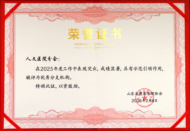 2月7日至8日,山东省健康管理协会召开三届三次理事会暨2025年度学术年会,会上公布了优秀分支机构评选结果,由山东大学附属威海市立医院担任主委单位的人文医院分会凭借扎实的工作成效、突出的行业引领力和广泛的社会影响力,荣获优秀分支机构称号。