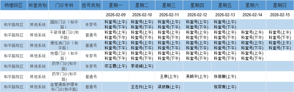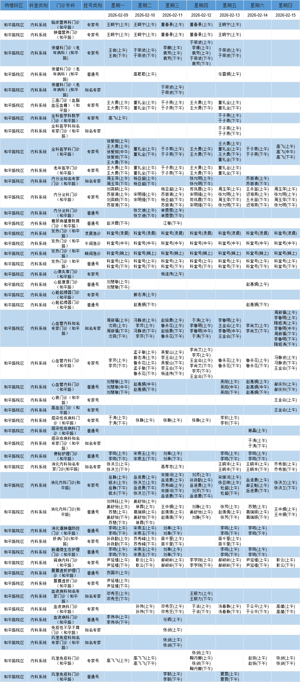 和平路院区内科系统门诊排班表