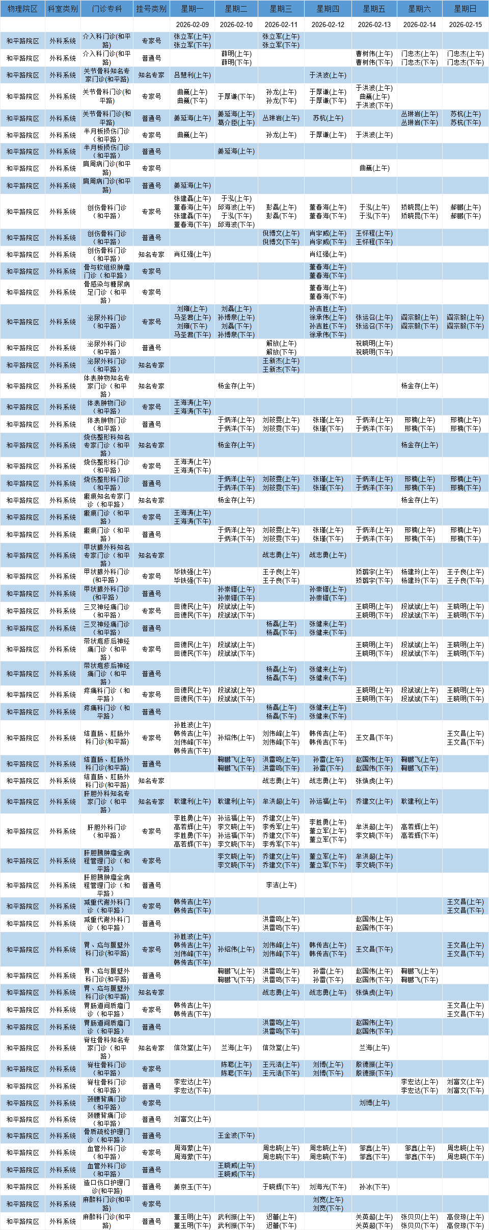和平路院区外科系统门诊排班表