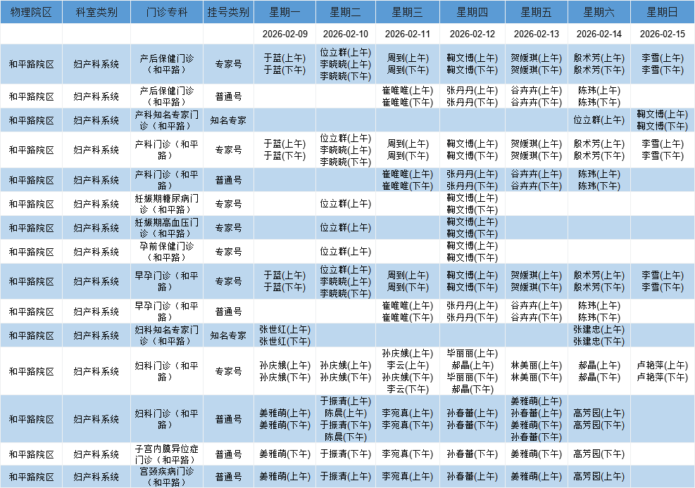和平路院区妇产科系统门诊排班表