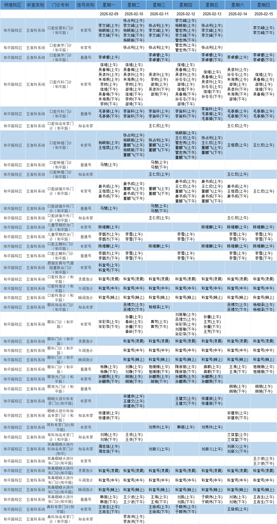 和平路院区五官系统门诊排班表