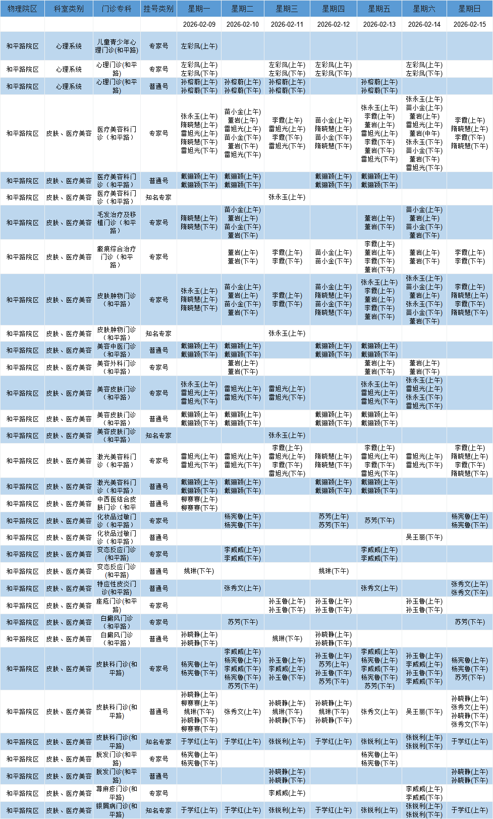和平路院区心理、皮肤、医疗美容系统门诊排班表