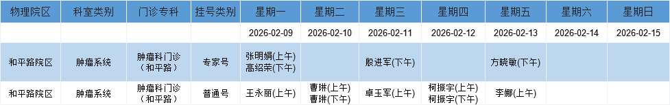 和平路院区肿瘤系统门诊排班表