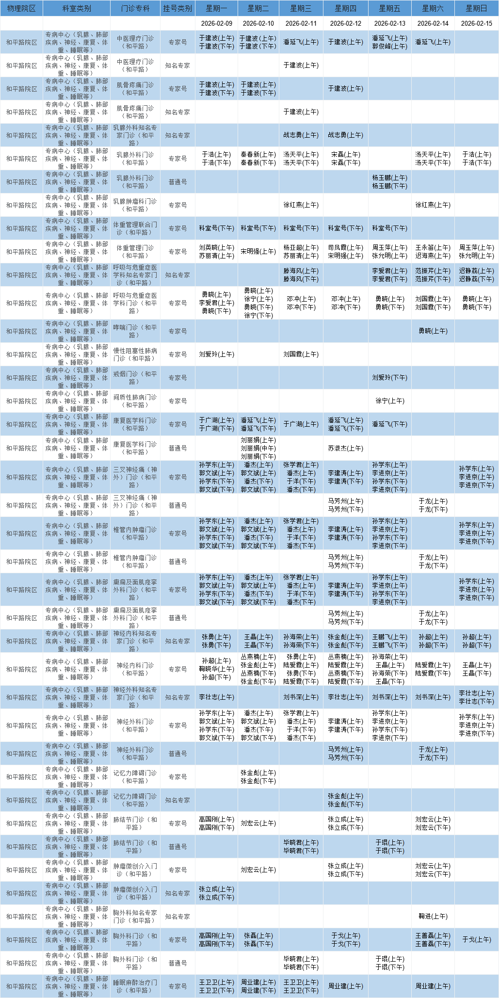 和平路院区专病中心门诊排班表