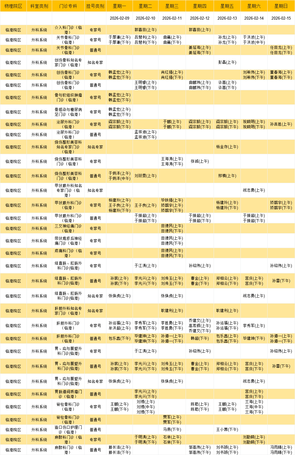 临港院区外科门诊排班表