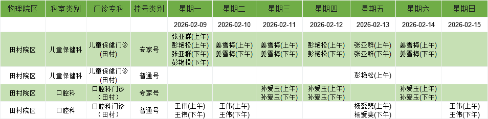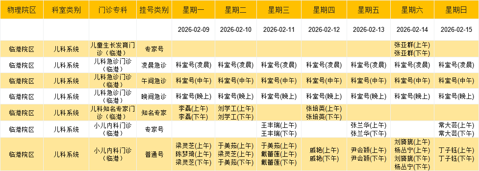 临港院区儿科系统门诊排班表