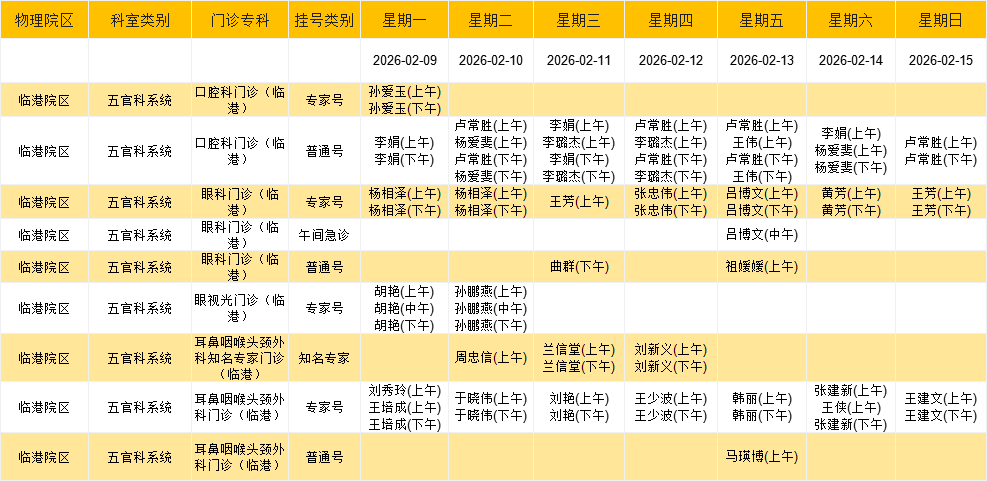 临港院区五官系统门诊排班表