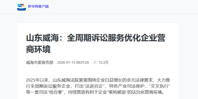 近日,新华网以《山东威海:全周期诉讼服务优化企业营商环境》为题,聚焦威海法院紧紧围绕企业日益增长的多元法律需求,大力推行全周期诉讼服务企业,打出“法进百企”、特色产业司法保护、“交叉执行”等一套司法“组合拳”,持续营造有利于企业“乘风破浪”的法治化营商环境的经验做法。以下为报道原文: