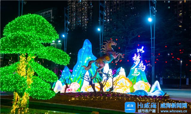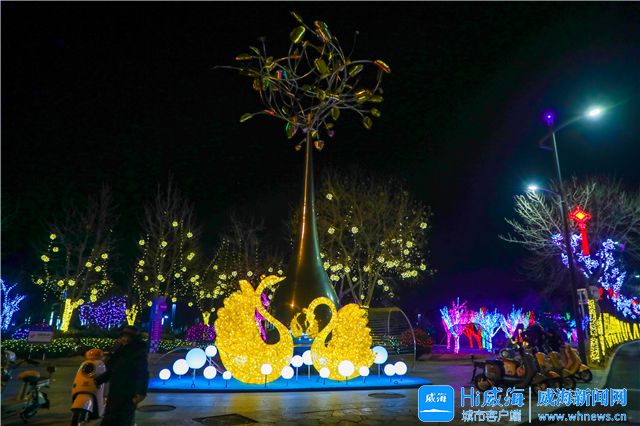 市人民广场的巨型中国结、威海公园大相框旁的“雪人”、海上公园的卡通形象、高新广场的璀璨灯墙、宝泉路与新威路交叉口的“花漫星河”……造型各异的花灯,璀璨夺目、亮眼吸睛,在光影交织间,绽放出迷人的节日光彩。