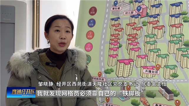 经开区西苑街道天隆社区党总支书记、居委会主任邹晓静说:“根据这么多年的网格工作经验,我就发现网格员必须要靠自己的‘铁脚板’,每天到网格里走一走、转一转才能发现问题,根据这个问题能早介入来早解决。”