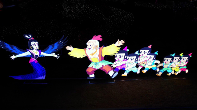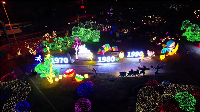 灯会融合威海滨海地域特色与光影艺术,巧妙串联起不同年代的集体记忆。从中轴线上的“光影流年”胶片拱门,到老电视播放的《哪吒闹海》与4K电视呈现的《哪吒之魔童降世》隔空对话,再北侧园路的“童年印记”长廊,“大朋友”和“小朋友”都能找到属于自己的“时代回音”。