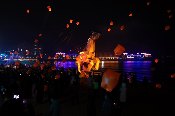 从山西来威游玩的游客吕梦洋,在半月湾沙滩看完表演后,和大家一起,将写有“平安”的电子祈福灯升到天空,“这是一个非常有仪式感的小年夜,也是在威海的一段美好旅程记忆。”她兴奋地说。