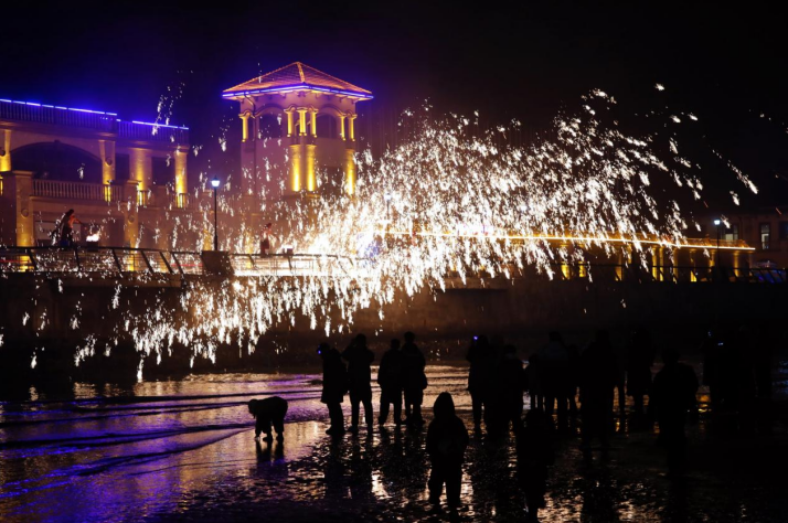 夜光舞狮率先登场,在光影流转中展现展现舞狮的灵动与美感,热闹的氛围迅速蔓延,带动了全场的欢腾;鱼灯巡游随后登场,一队人手持象征吉祥如意、金榜题名的荧彩鱼灯,鱼鳞在光影中闪烁流动,将新春的祝福洒遍每个角落,不少市民游客跟随队伍祈福纳祥;紧接着,"山海炽夜"主题火壶与打铁花表演上演,层层飞花如瀑布飞泻,又如同烟花一般照耀夜空,流光溢彩、耀眼夺目,以火与海完美结合带来震撼的视觉盛宴。