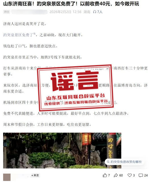 济南互联网联合辟谣平台提醒广大市民和游客,春节假期临近,出行游玩需求增多,景区相关票务政策、开放时间等重要信息,请通过官方正规渠道获取,自觉做到不造谣、不信谣、不传谣,共同维护清朗网络空间。