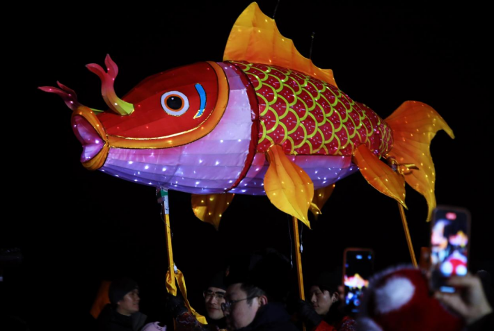 夜光舞狮率先登场,在光影流转中展现展现舞狮的灵动与美感,热闹的氛围迅速蔓延,带动了全场的欢腾;鱼灯巡游随后登场,一队人手持象征吉祥如意、金榜题名的荧彩鱼灯,鱼鳞在光影中闪烁流动,将新春的祝福洒遍每个角落,不少市民游客跟随队伍祈福纳祥;紧接着,"山海炽夜"主题火壶与打铁花表演上演,层层飞花如瀑布飞泻,又如同烟花一般照耀夜空,流光溢彩、耀眼夺目,以火与海完美结合带来震撼的视觉盛宴。