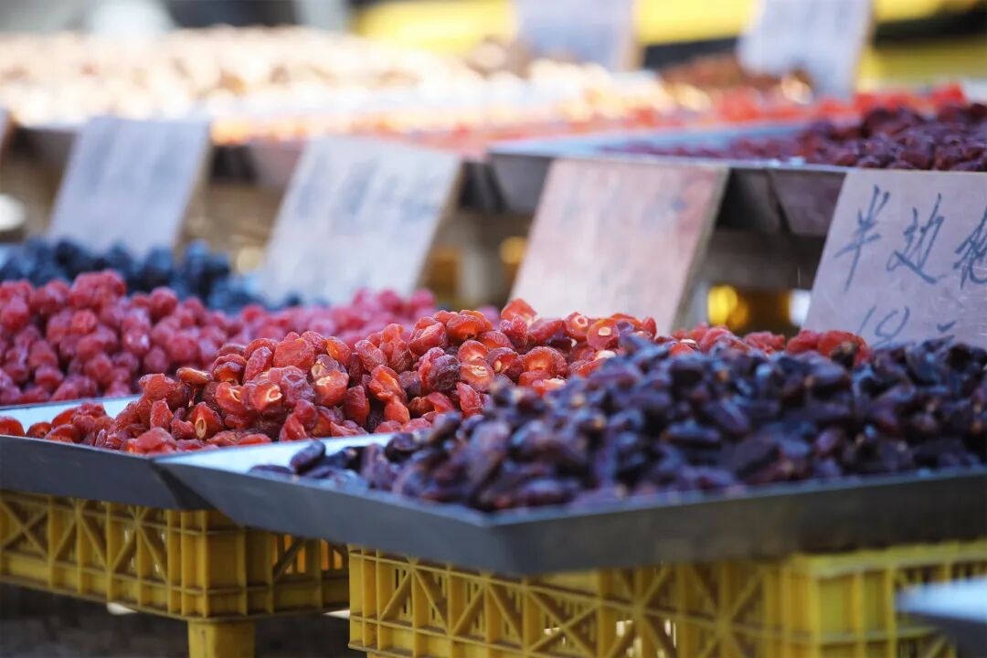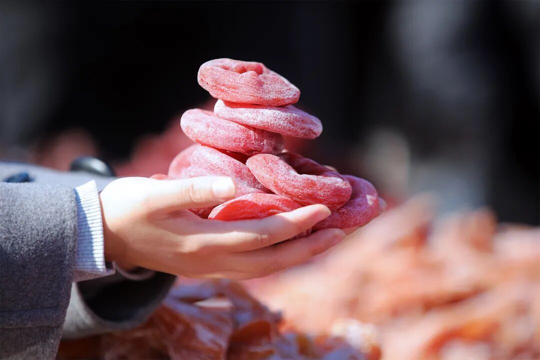 摊位上,蜜饯干果种类丰富,柿饼整齐地摆放着,表皮覆盖着一层自然形成的白霜,外形圆润饱满,色泽红润透亮,承载着“万柿如意”与“柿柿顺心”的美好寄寓。