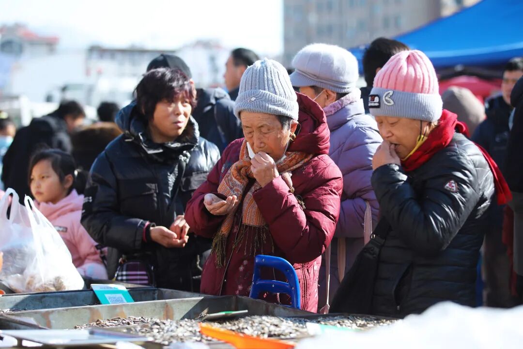 早上六点,商贩们陆续从四面八方赶来,呵着白气,手脚利落地挂起红火的春联、摆开琳琅满目的炒货和新鲜地道的海鲜。不到一小时,街道两侧已被摊位填得满满当当。