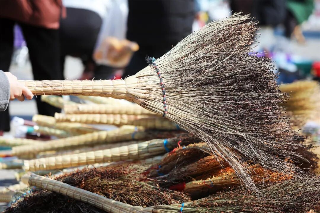 掸尘扫屋是临近春节的习俗。在大集上,高粱秸笤帚整齐摆放,朴素又实在,一把在手,扫去旧岁尘埃,也带来新年的好运。