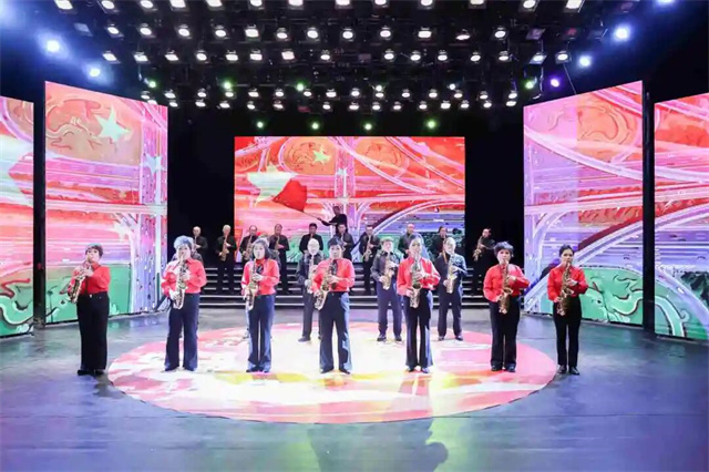 威海市老年大学献上的萨克斯演奏《我爱你中国》,深情款款、触动人心,表达对祖国的真挚情感,许多人感动鼓掌。