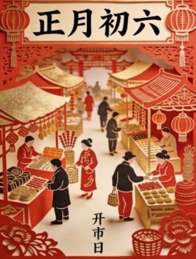 正月初六也是民间的“开市日”,腊月里歇业的商铺、摊贩,会在正月初六清晨开门营业,盼新的一年生意兴隆、客源广进,开门后第一笔生意被称为“开市彩头”,人们都盼着能迎来好生意,为新年的经营开个好头。