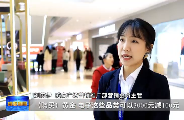 威高广场营销推广部营销会员主管刘芮伊表示,购买黄金、电子这些品类可以3000元减100元,买衣服的话可以500元减50元;顾客初二、初三来消费,满199元用积分可以领一张开乐影城观影券,在初三的时候会进到一些餐饮门店里面去给大家送抽免单的活动,属马、姓马还有名字带马的朋友,参与活动,可以领取一份黄金小马的礼品。