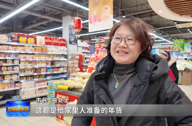 今天,威海各大超市也迎来新春热潮。这边,摆满了寓意吉祥的年货礼盒;那边,新鲜的果蔬被精心挑选进篮。市民们推着购物车穿梭其间,开启了热热闹闹的“年货模式”。