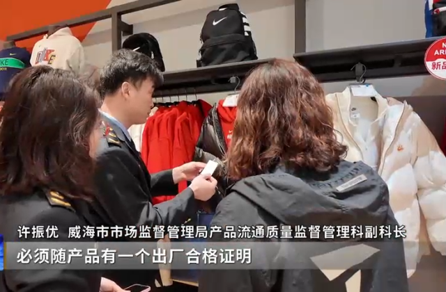 威海市市场监督管理局产品流通质量监督管理科副科长许振优说,羽绒服的标签标识,必须随产品有一个出厂合格证明,厂名、厂址,品名……