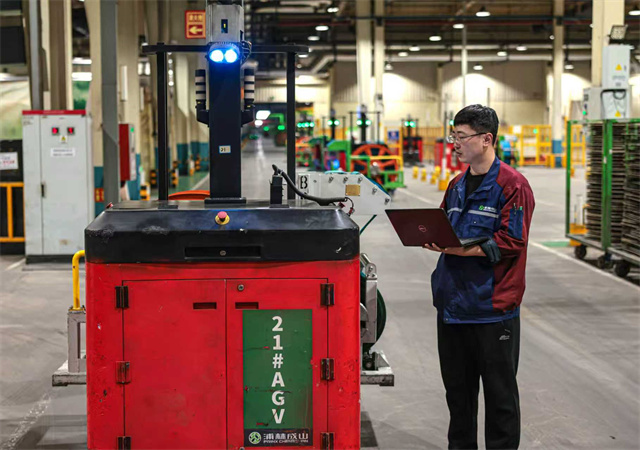 浦林成山(山东)轮胎有限公司智能化生产车间内,自动驾驶智能运输车配送原料。