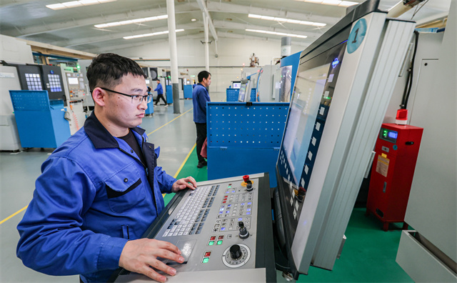 在威高骨科材料股份有限公司生产车间内,工人正在生产骨科关节产品部件。