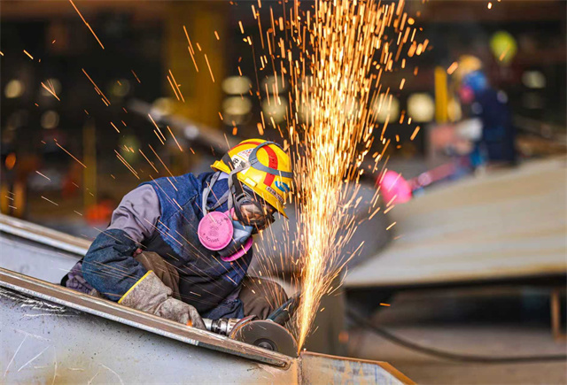 在三星重工业(荣成)有限公司生产车间内,工人们赶制大型液化天然气(LNG)运输船船段。