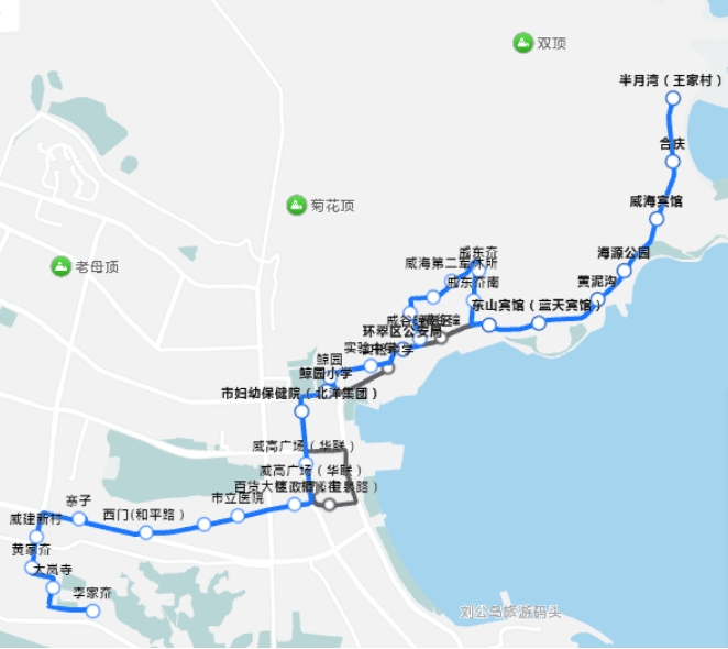 站点设置:李家夼、大岚寺、黄家夼、威建新村、寨子、西门(和平路)、金猴集团、市立医院、百货大楼(栖霞街)【发往半月湾方向不停靠】、威高广场(华联)、市妇幼保健院(北洋集团)、鲸园小学、鲸园、实验中学、环翠区公安局【发往半月湾方向不停靠】、戚谷疃西【发往李家夼方向不停靠】、戚谷疃南区【发往半月湾方向不停靠】、戚谷疃北区【发往半月湾方向不停靠】、巡警支队、威海第二军休所、戚东夼、戚东夼南、白云宾馆南【发往李家夼方向不停靠】、白云宾馆【发往半月湾方向不停靠】、东山宾馆(蓝天宾馆)、黄泥沟、海源公园、威海宾馆、合庆、半月湾(王家村)。