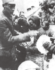 解放战争时期,欧阳文(左一)为地方劳动生产模范戴大红花。
