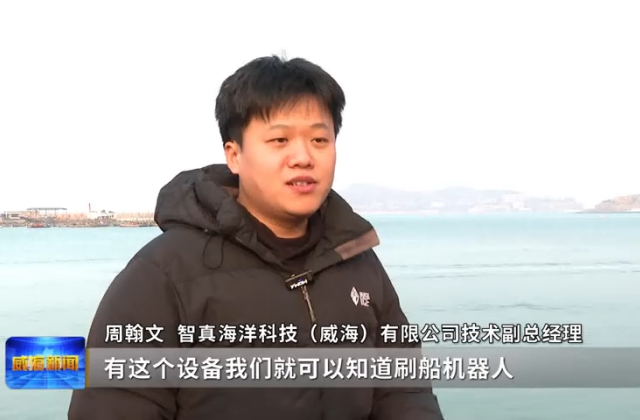智真海洋科技(威海)有限公司技术副总经理周翰文说,有这个设备在,就可以知道刷船机器人在船底的一个精确位置,这样的话就能把船底清洗刷得更干净。这个方案也是现在目前来说比较独创的一个技术。