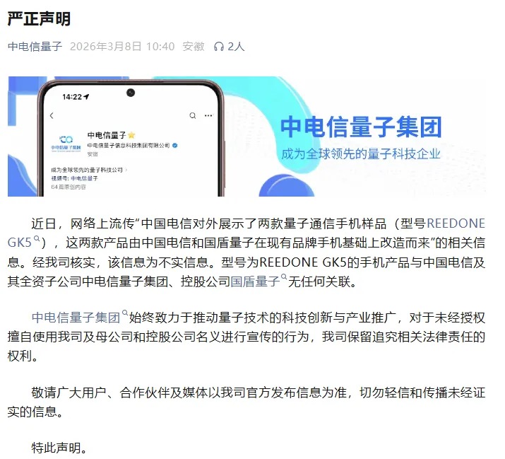 中电信量子集团指出,型号为REEDONE GK5的手机产品与中国电信及其全资子公司中电信量子集团、控股公司国盾量子无任何关联。对于未经授权擅自使用公司及母公司和控股公司名义进行宣传的行为,公司保留追究相关法律责任的权利。敬请广大用户、合作伙伴及媒体以公司官方发布信息为准,切勿轻信和传播未经证实的信息。