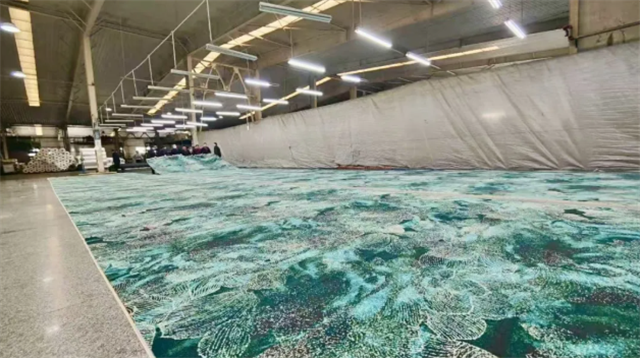 走进山花地毯的编织地毯车间,机器轰鸣声此起彼伏,数台高速织机正吐出各色纱线,编织成花纹别致的地毯,工人们在工序间穿梭忙碌。在产品检验区,几名工人正合力将一块长约75米、宽约4米的绿色繁花纹样地毯缓缓铺开,两名检验员手持量尺和检测设备,仔细测量、反复核验。“像这种拼缝的地方,需要重点检查花纹图案能否完全对上,尺寸有没有误差。”其中一名检验员介绍。