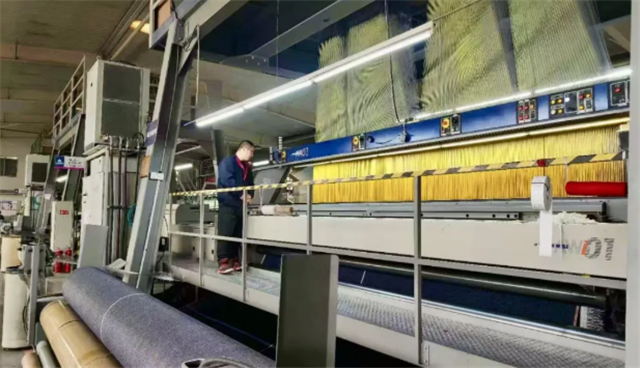 与此同时,公司传统手工地毯的生产方式也在悄然变革。在手工枪刺地毯车间,8台手工枪刺地毯机器人正有序作业,精准完成点位走线。“以前手工地毯主要靠工人手工枪刺,随着工人年龄增长、体力下降,人机结合是大势所趋。”陈明波介绍,公司正与国内一厂家合作研发鹰眼识别类手工枪刺地毯机器人,作业时可区分颜色、枪刺更为精准,一旦投用,将大幅降低成本、提升效率。
