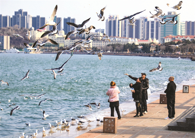 在幸福公园海边,卖了十年旅游纪念品的经营业主马长江,手里的海鸥粮就没断过,忙得不亦乐乎。“前几年,幸福门这儿的海鸥也就几十只,零零散散的。现在你再看看,铺天盖地的!”他笑着指向海面,顺着他手指的方向望去,成百上千只海鸥正迎着海风,或低掠过水面,或振翅高飞,引得游人阵阵惊呼。