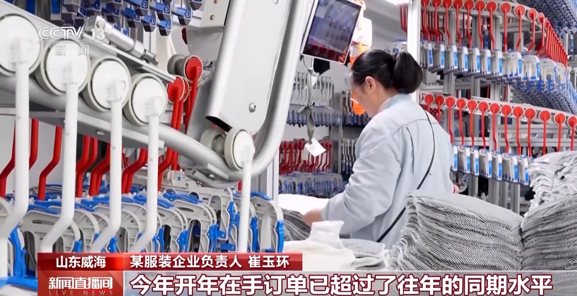 某服装企业负责人 崔玉环:现在所有生产线都满负荷运转,产能已恢复到年前水平。今年开年在手订单已超过了往年的同期水平,大家都在保订单、紧张生产的状态当中,我们一季度订单目标是全力提效、保质、保交付。