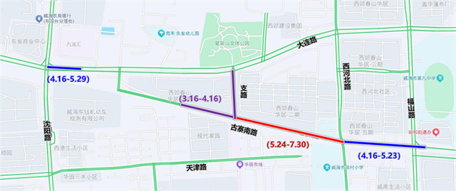 1.春山华居内支路(大连路—古寨南路),施工时间为3月16日至4月16日,占用西半幅道路,机动车、非机动车双向混行,行人靠东侧人行道通行。