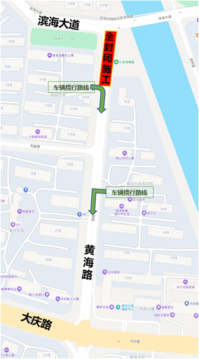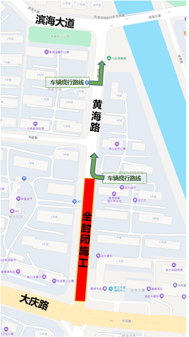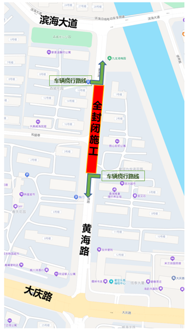 第三阶段:施工范围为九龙湾花园小区西门至大庆路路口,施工长度220米,计划施工时间为4月16日至5月5日,工期20天,小区车辆均需向北绕行滨海大道。