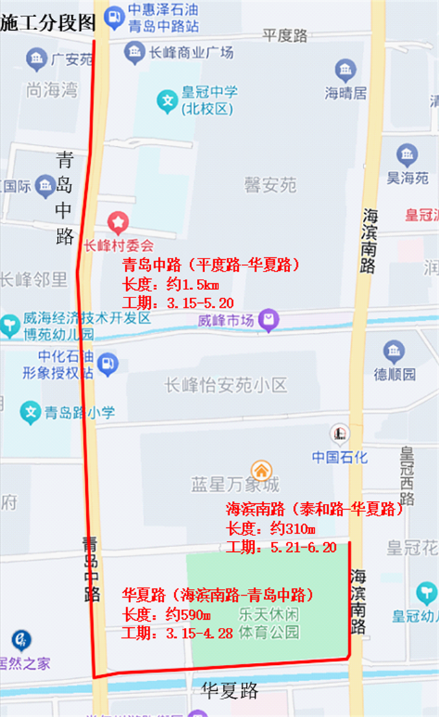2.华夏路(海滨南路—青岛中路)施工时间为2026年3月15日至2026年4月28日,占用北半幅外侧非机动车道及1条机动车道。