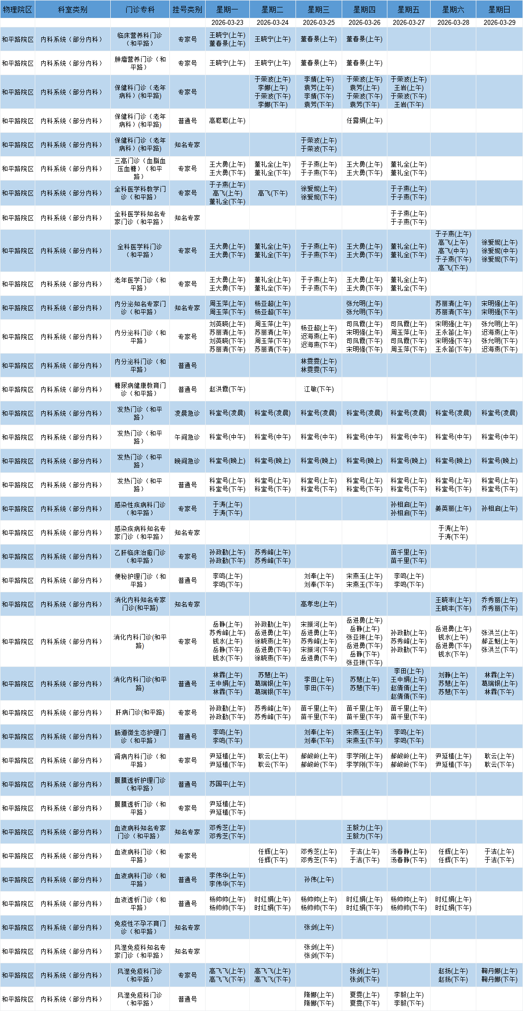 和平路院区内科系统门诊排班表