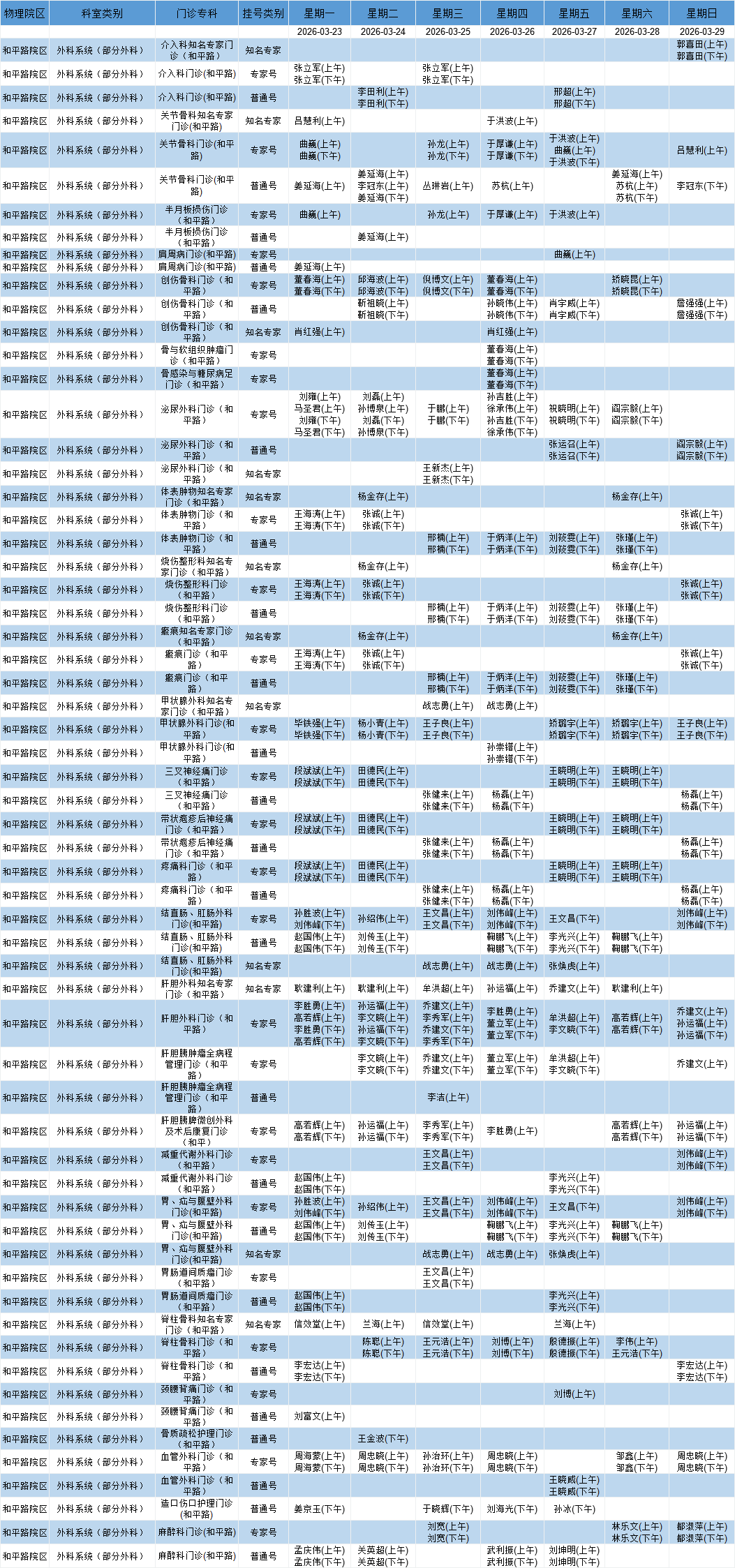 和平路院区外科系统门诊排班表