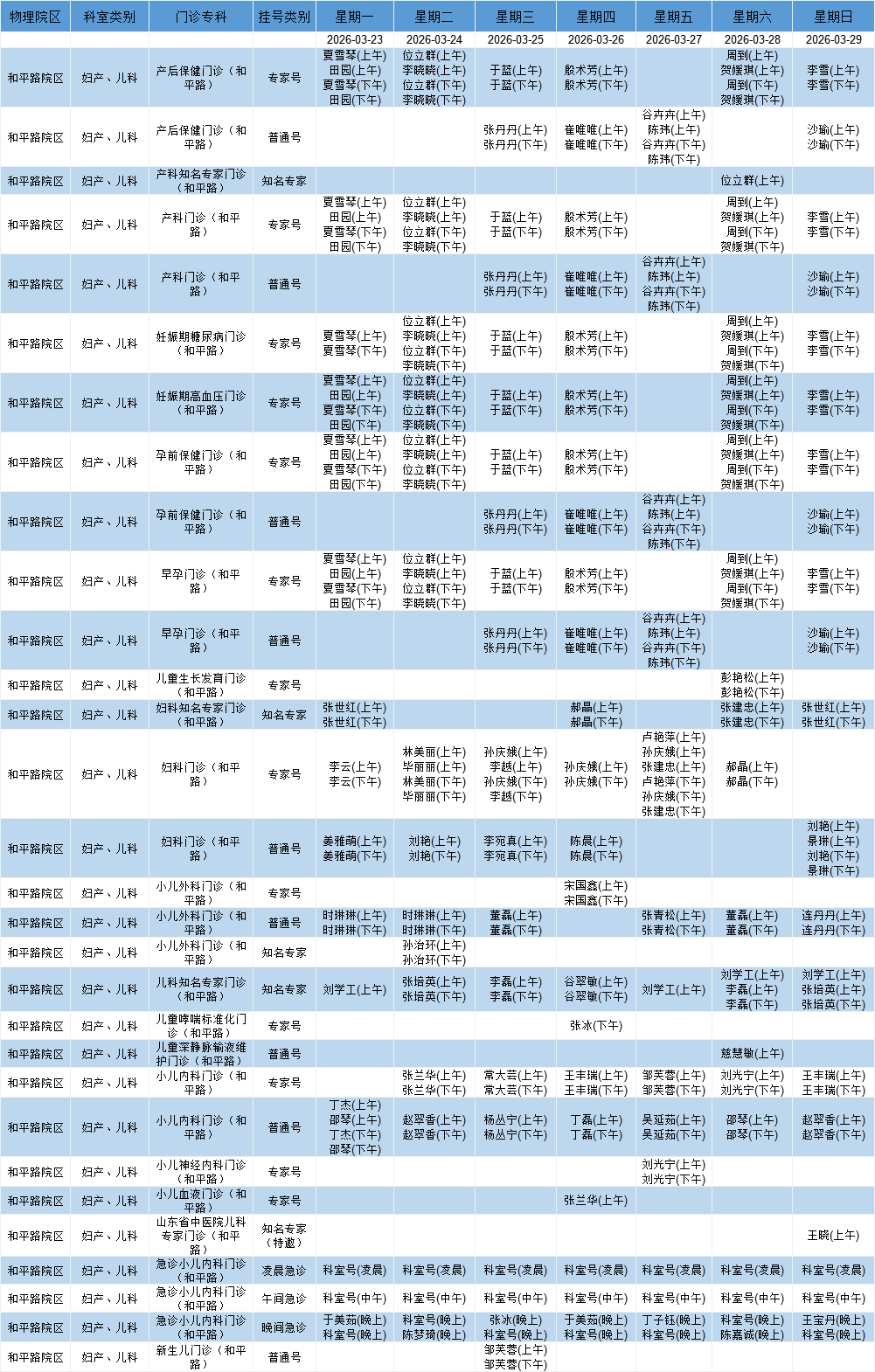 和平路院区妇产、儿科系统门诊排班表