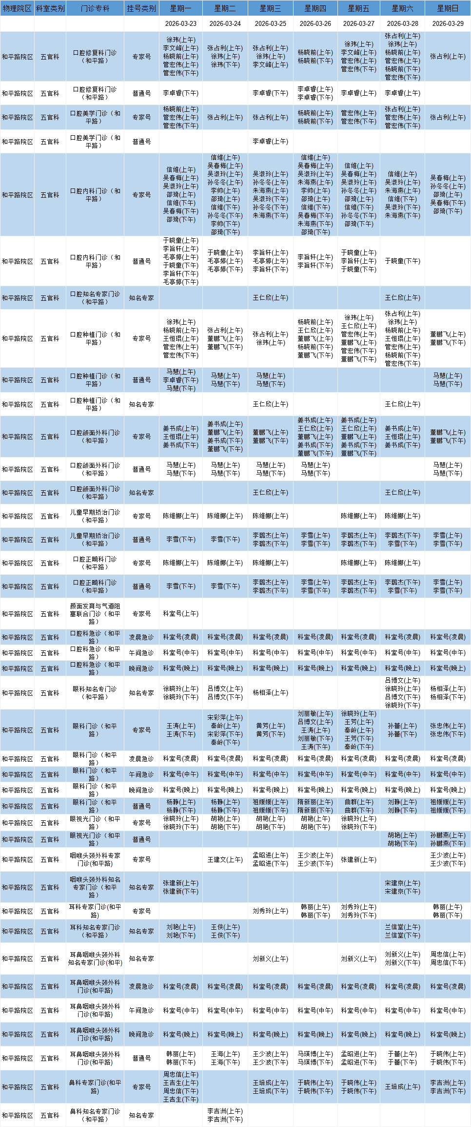 和平路院区五官系统门诊排班表